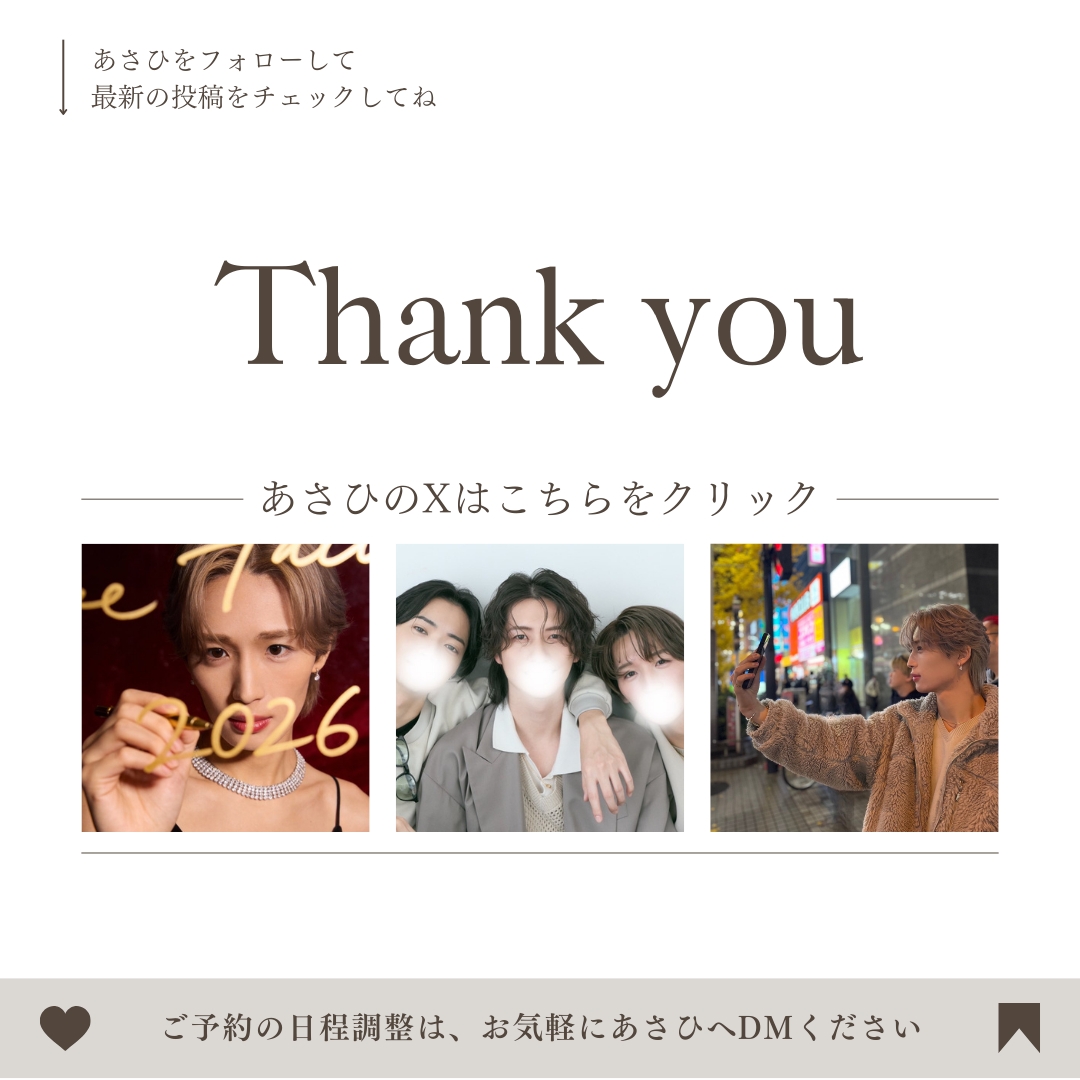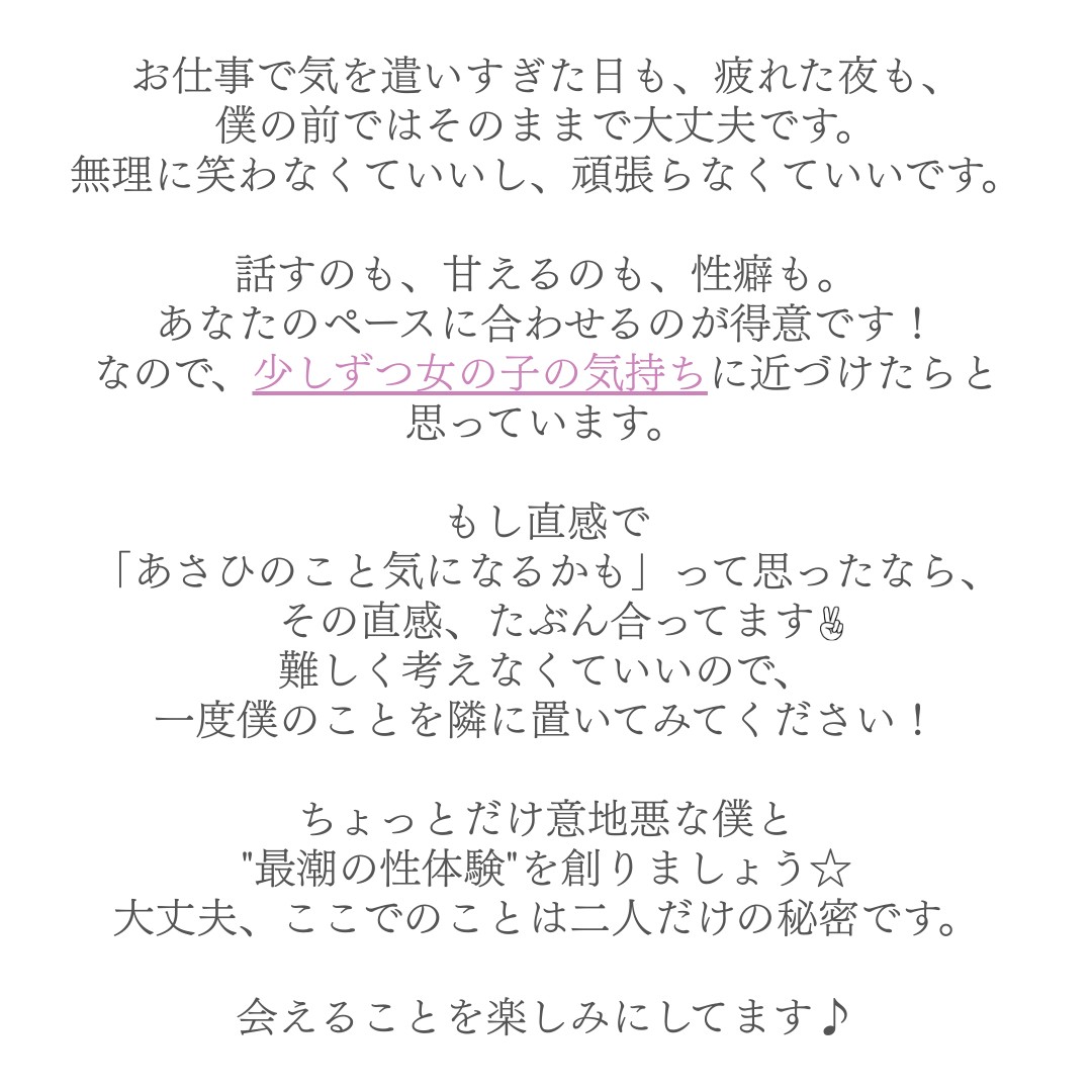 半年前に女風を始めて利用した時、あまりいい思い出がなく、残念な気持ちでそれ以来使ってなかったのですが、あさひくんをXで見つけて直感でこの人に会ってみたいと思いすぐDMしました!