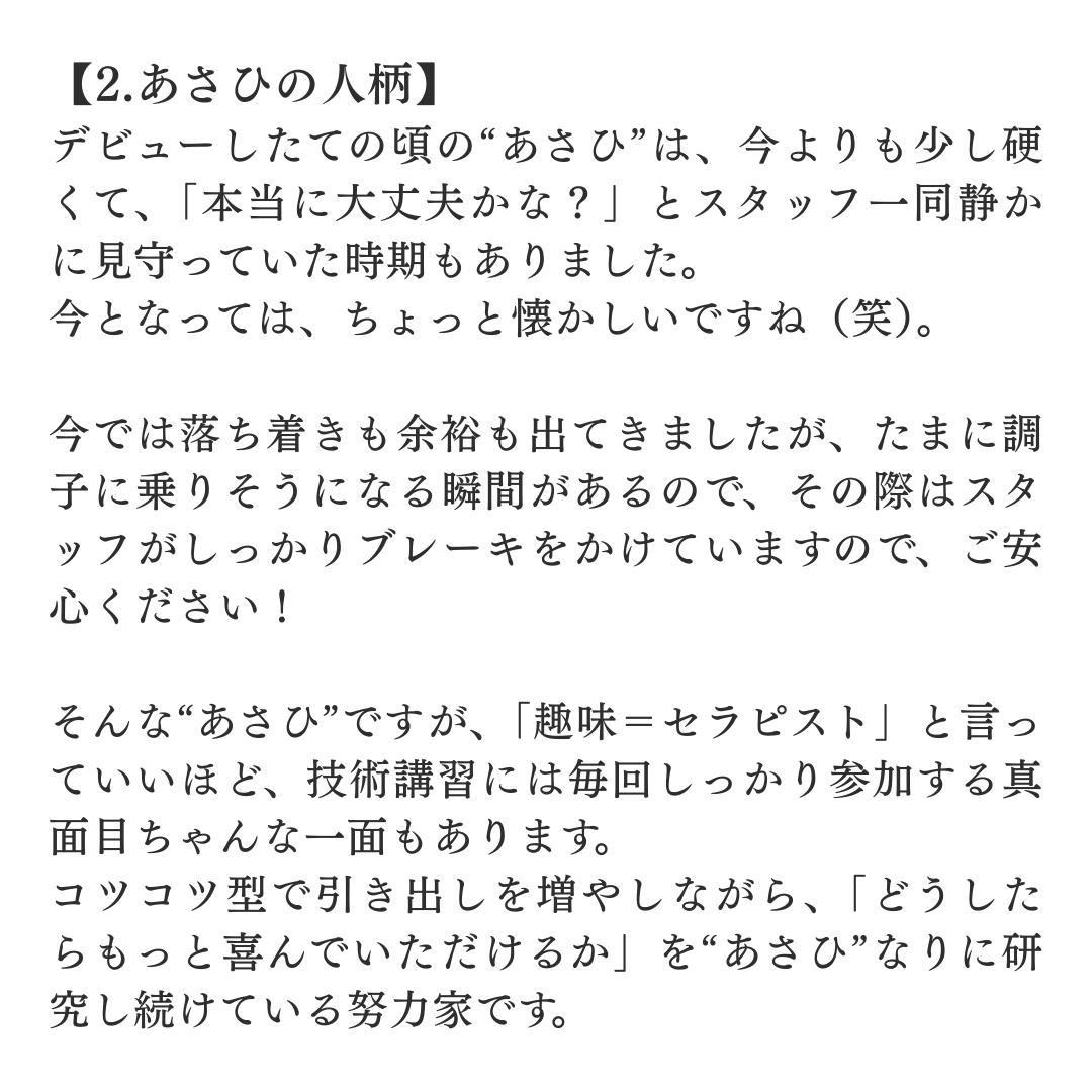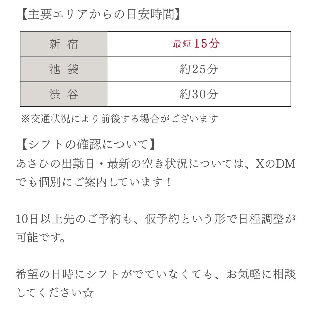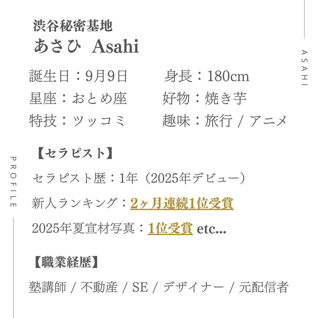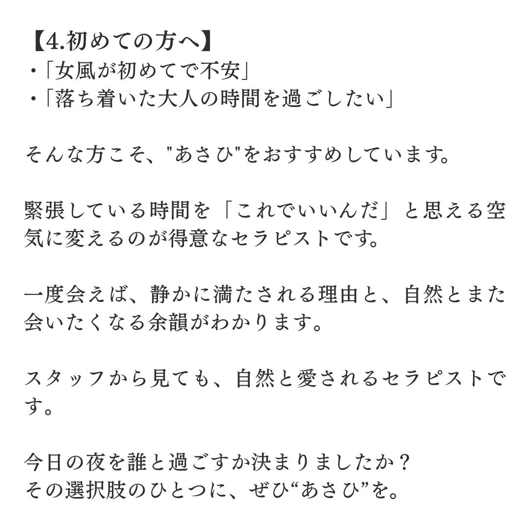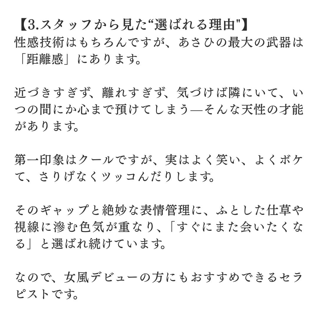 Xで、あさひくんを発見してからずっと会ってみたいなぁと思ってタイミングで大阪出張!の投稿を見たのですぐに予約しました合流した瞬間から高身長にまずきゅん。その日美容Dayと伝えていたのでまずネイル褒めてくれたの嬉しかったし性感でもアロマ選び、️キャンドル持参してくれたりおもてなしに感動しました普段緊張しませんがずっとメロい時間で︎︎︎書き込みたく事はたくさんありますがトータルでたくさん癒しをくれて大満足でした絶対また逢いたいとすぐに思った方です。人としても好感度が持てたので本当におすすめのセラピストさんでした