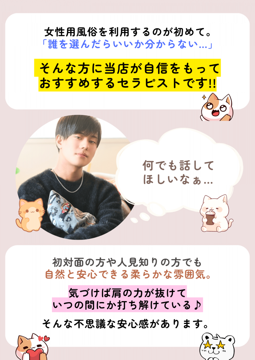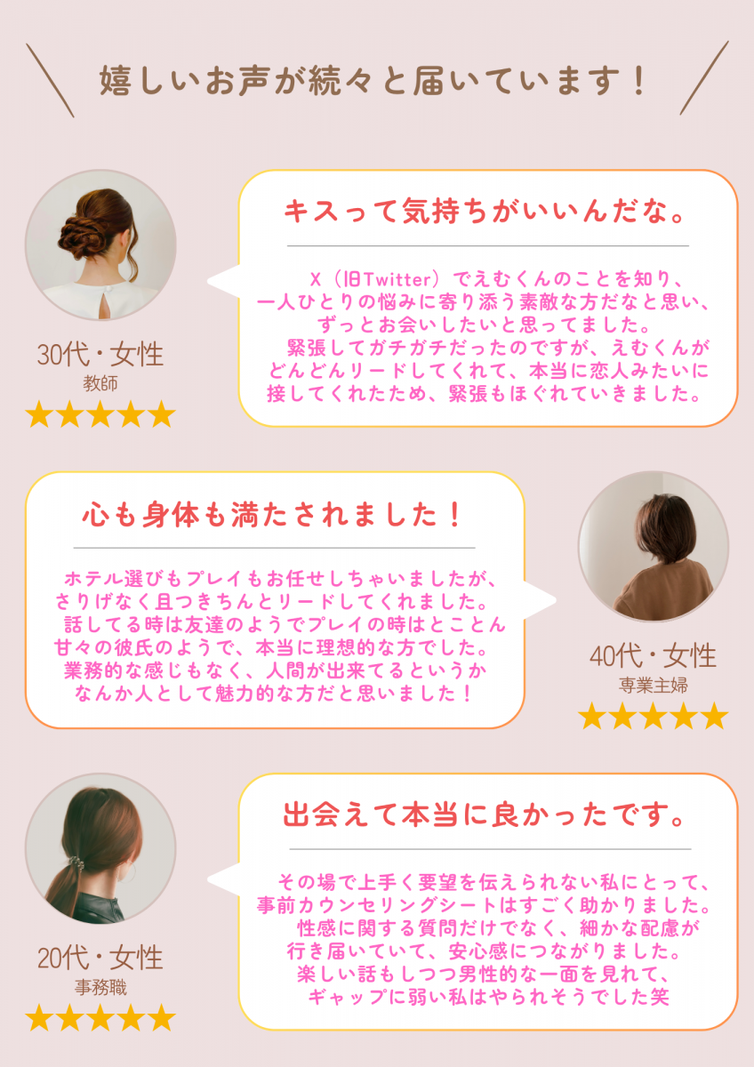 気持ち的に少し落ち込んでて、誰かから大切に扱われたいって思ってたんですけど、すごくすごく丁寧に扱ってくれて、気持ちも吐き出させてもらってスッキリしました。
