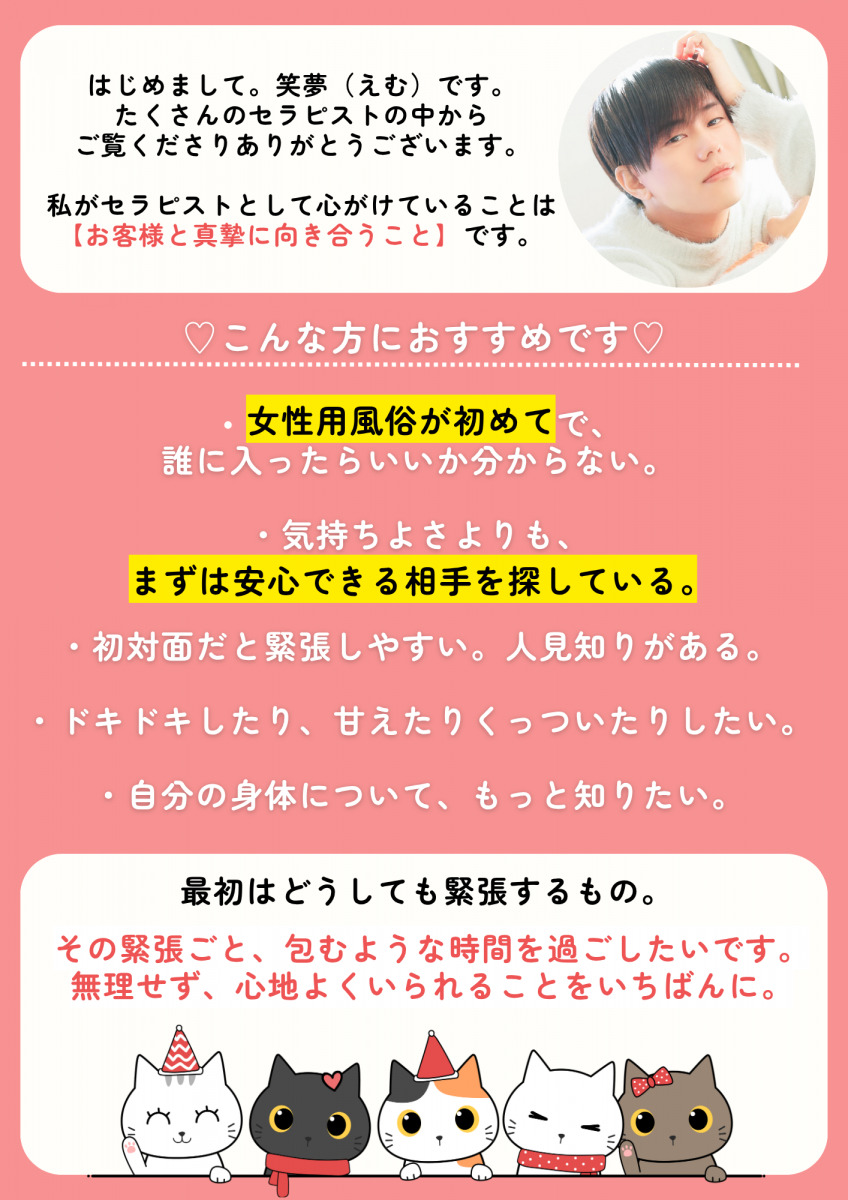 初めての女性用風俗のご利用に、笑夢を選んでくださり大変光栄です!