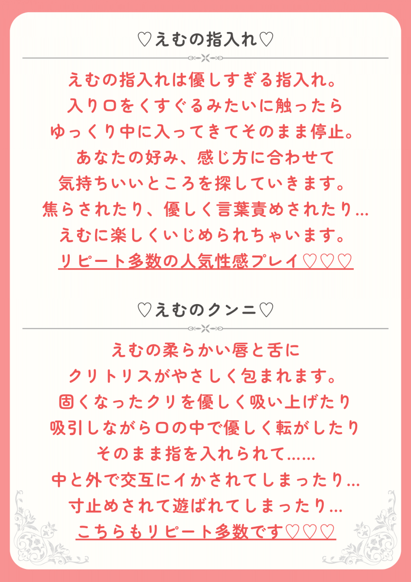普段あまりイった事が無く、前戯も含めて男性経験もなかった事に悩んでました。今回、気持ちよくなりたいという気持ちが我慢できず利用しましたが、エスさんはとても優しくいじわるに、そしていちゃ甘な感じで良かったです!
