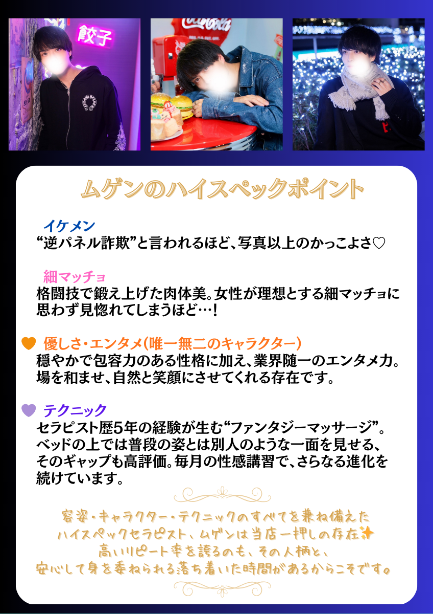 今日も楽しい時間をご一緒出来、ありがとうございました。感謝しか無いです。時間を空けず、直ぐに会いたくなりますし、ファンが多いのも納得です。エロ優しいムゲンさんの虜です。これからも、よろしくお願い致しますm(_ _)m