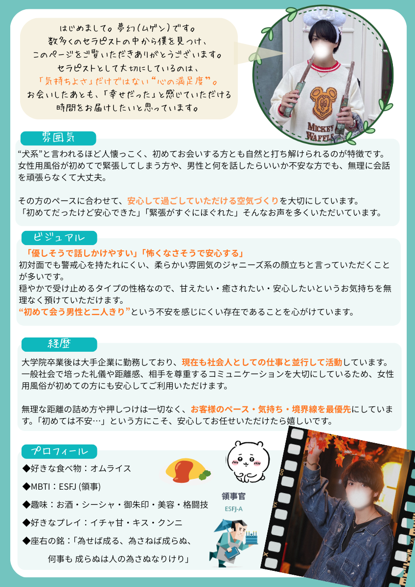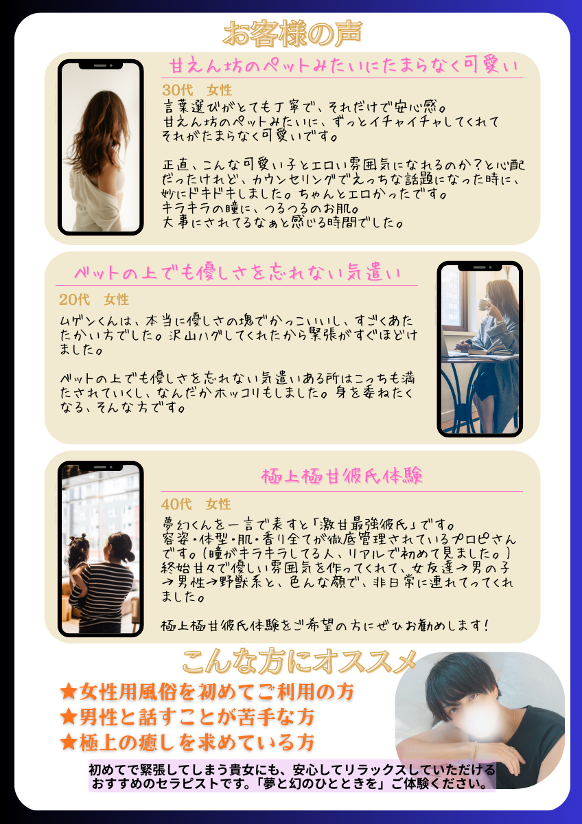 お顔を出されていないので、初めてご利用される方は、不安がたくさんあると思いますが、これを見て少しでも夢幻さんの良さが伝わればなと思います。