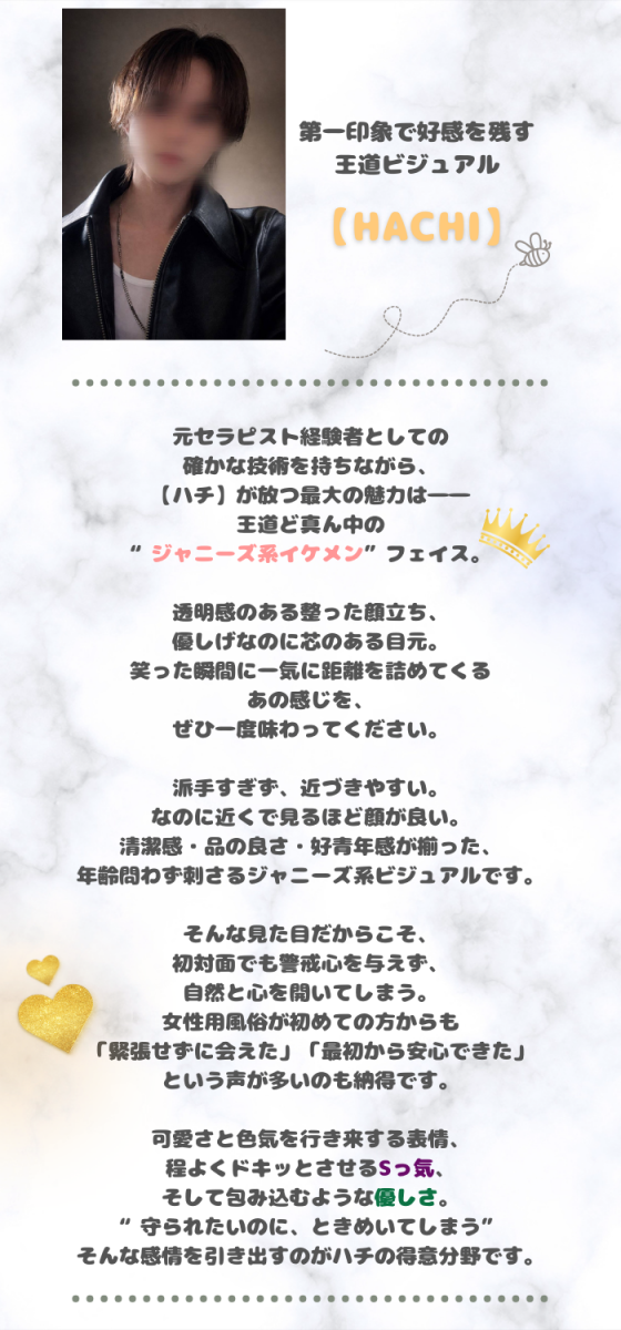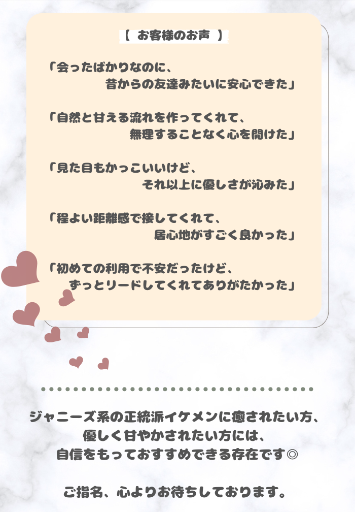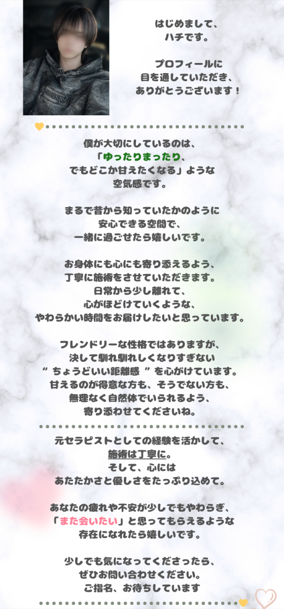 ハチ君今日はありがとう️全モザだからどんな人か不安な中DMさせてもらって私の中のハチ君のクールな冷たいイメージがいい意味で一気に崩れたよ(笑)お返事優しいし面白いし益々興味が湧いてイベントもあったので予約させてもらったよ️会った瞬間に『え?何このオシャレで都会っぽいイケメン』て思ったぁめっちゃ輝きすぎてて目を合わせるのに相当時間かかったよね(笑)エスコートも完璧で完全にお姫様扱いしてくれて嬉しかった️施術の方はさすがプロだけあって気持ちよくイケちゃった️ありがとね美意識高い男性といるだけで自分ももっと綺麗になろうと思わせてくれるハチ君だね一緒にいるとポジティブになれる人だなって思ったよ️今日は本当にありがとうお身体大切にこれからもお仕事頑張ってね️また会えるのを楽しみに私もお仕事頑張るねぇ