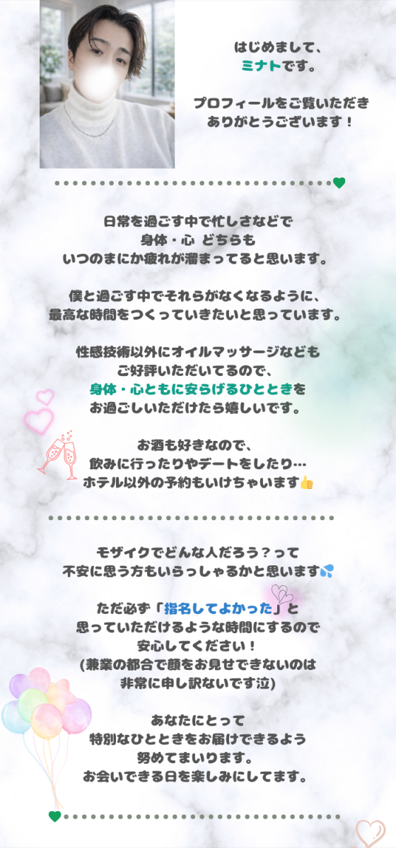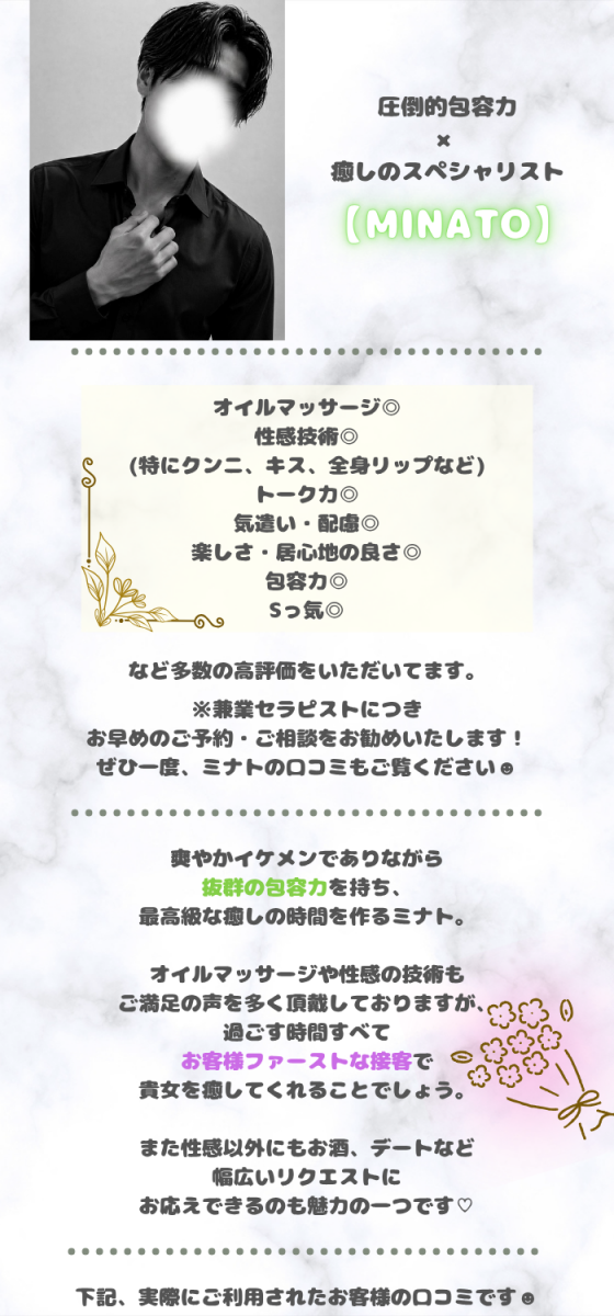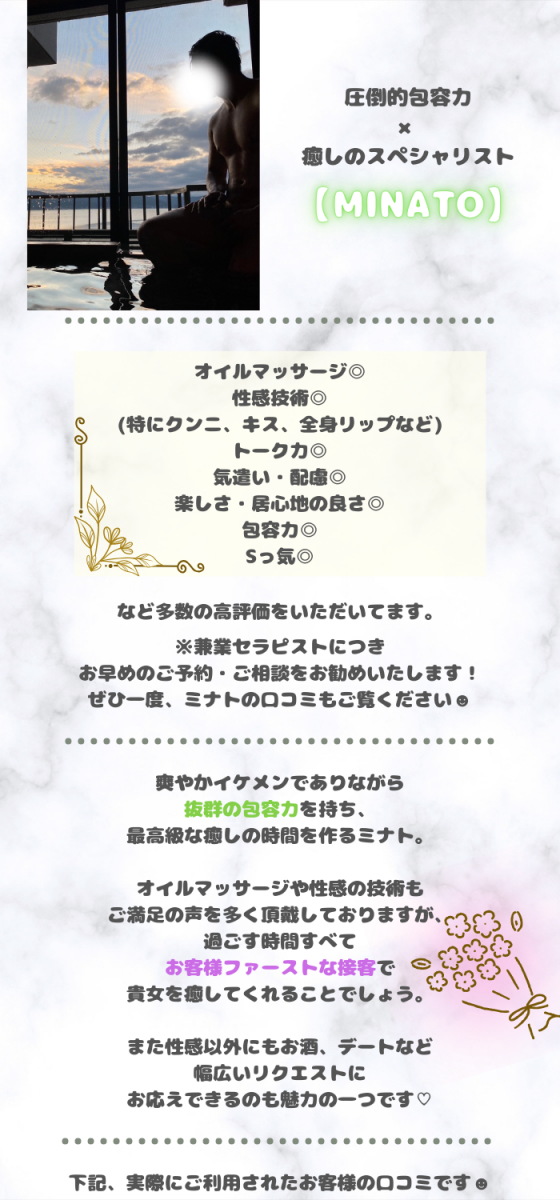 女風も数回しか予約させてもらってないけど、感じたことないくらいの楽しさとすぐに素を出せるくらいの雰囲気に持って行ってくれるみなとくんに感激を受けました