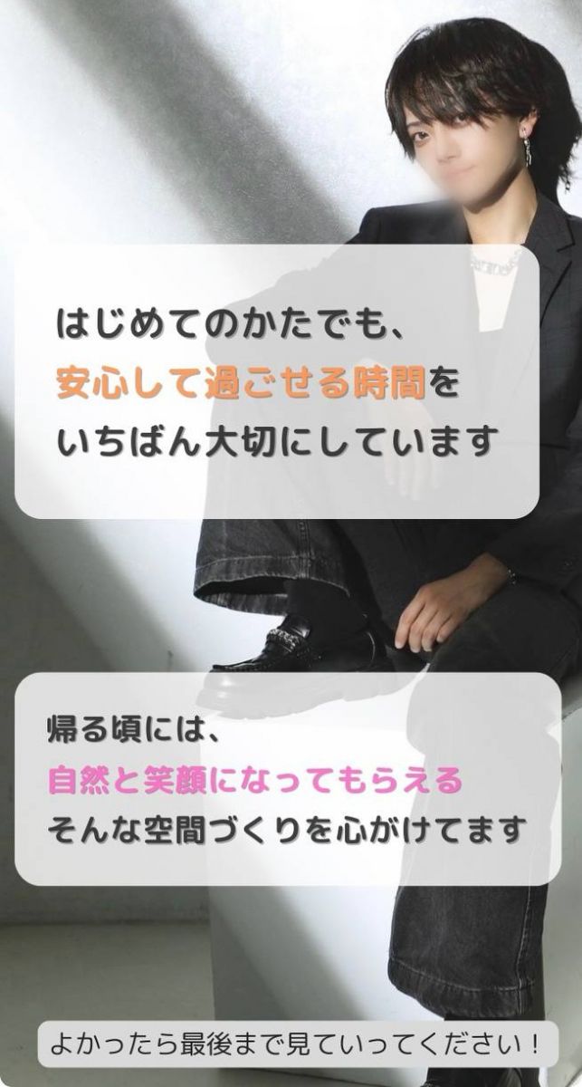 1人でいたくなくて、誰かと話して優しくしてほしいなと思い、思い切って予約しましたが、ずっと楽しませてくれて、本当に楽しい時間を過ごせました!